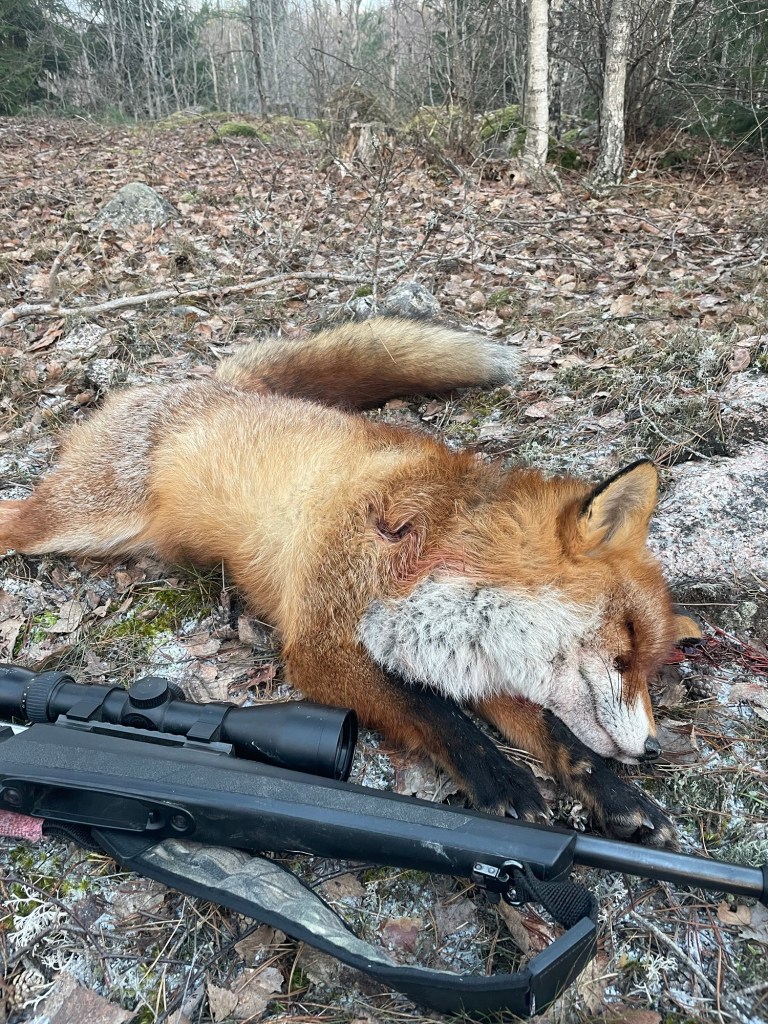 Märkliga djur ändå de där vildvinen. Denna gris gick 70 meter med lungträff. Ingen reaktion i skottet, den fortsatte i exakt samma tempo efter träffen. Laikan fick spåra. Detta var en rolig jakt med duktiga hundar och mycket djur i farten. Det sköts sex vildsvin och en räv. Räven kom i mitt pass och jag lyckades fälla den.