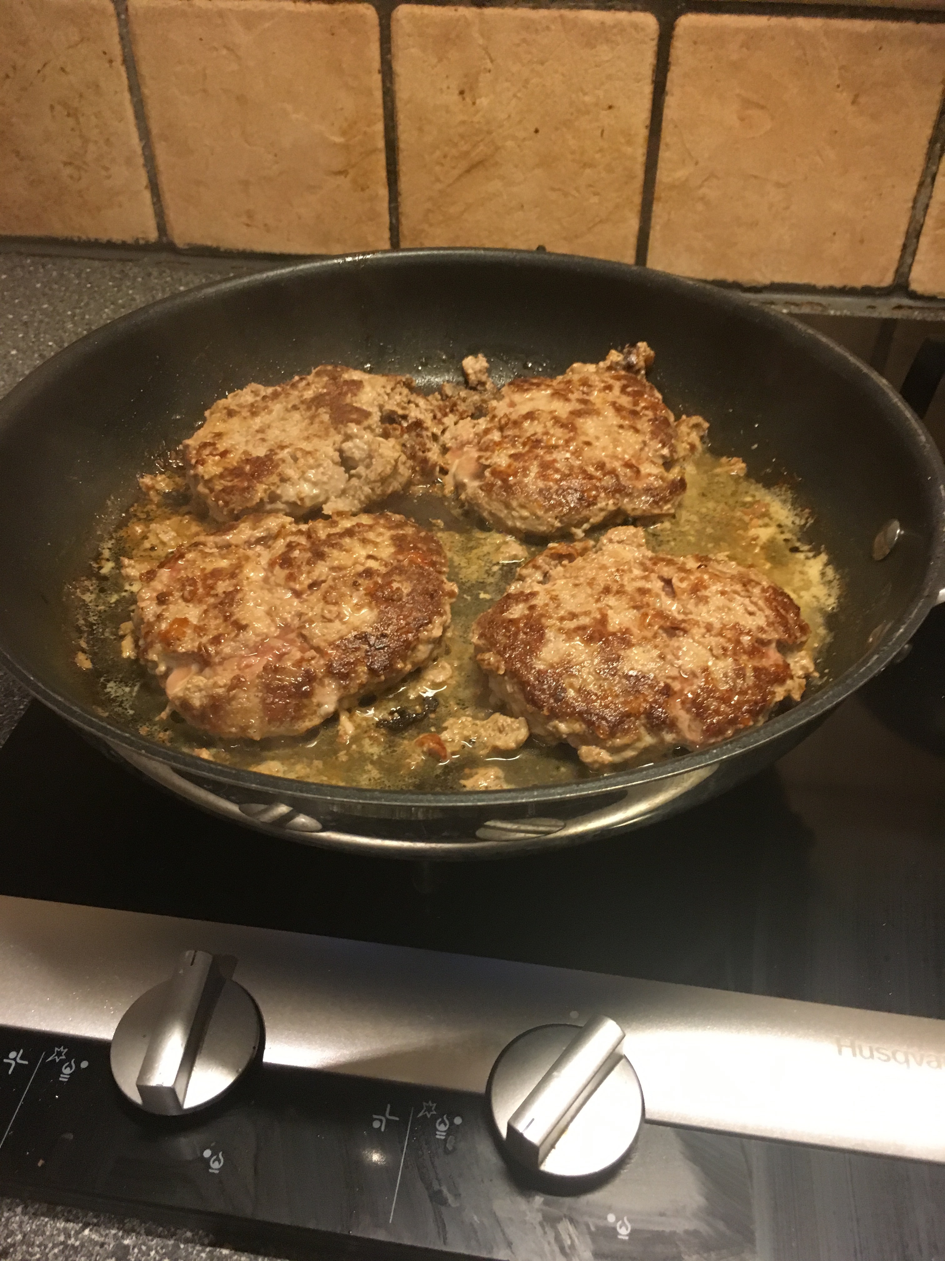 3. Ta färs, blanda i ägg, grädde, ströbröd, vitpeppar, salt, enbär och riven lök. Å en skvätt sherry! Stek sen biffarna som vanligt.