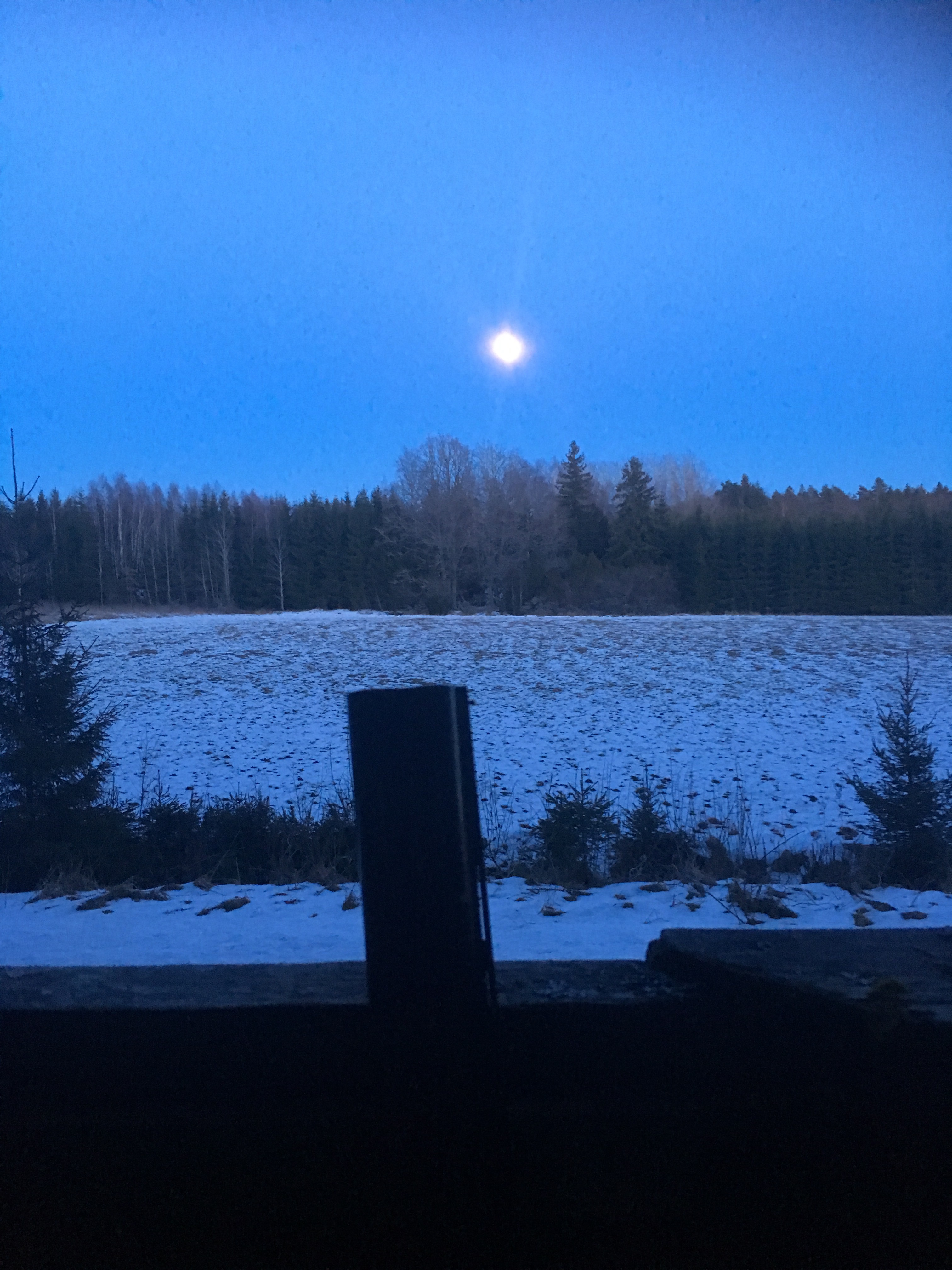 Till min stora glädje fick vi också höra kattugglor som pratade med varandra. Ibland kommer de flygande när de hör räv-lock-pipan. Fast inte ikväll. Men vackert var det att få se månen stiga till kattugglorna musik.