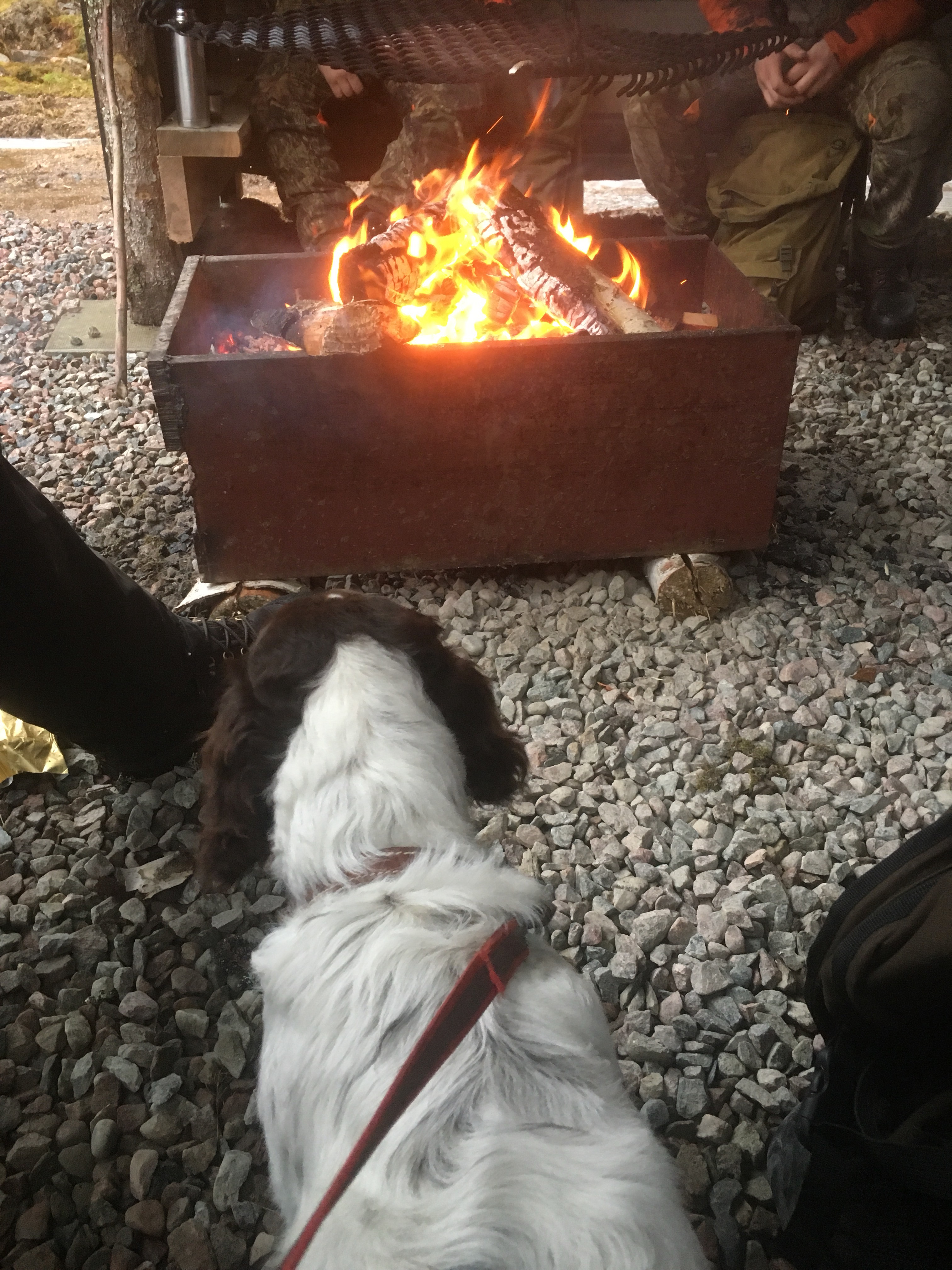 Ganska fort fick båda hundarna upp. Både jämten och laikan skällde ståndskall. Jag hörde inte så mycket utan fick information av hundförarna. Efter ca 45 min fick jag höra att en i jaktlaget hade skjutit en liten galt som jämten skällt på ganska länge men som sen gick loss. Kul!
