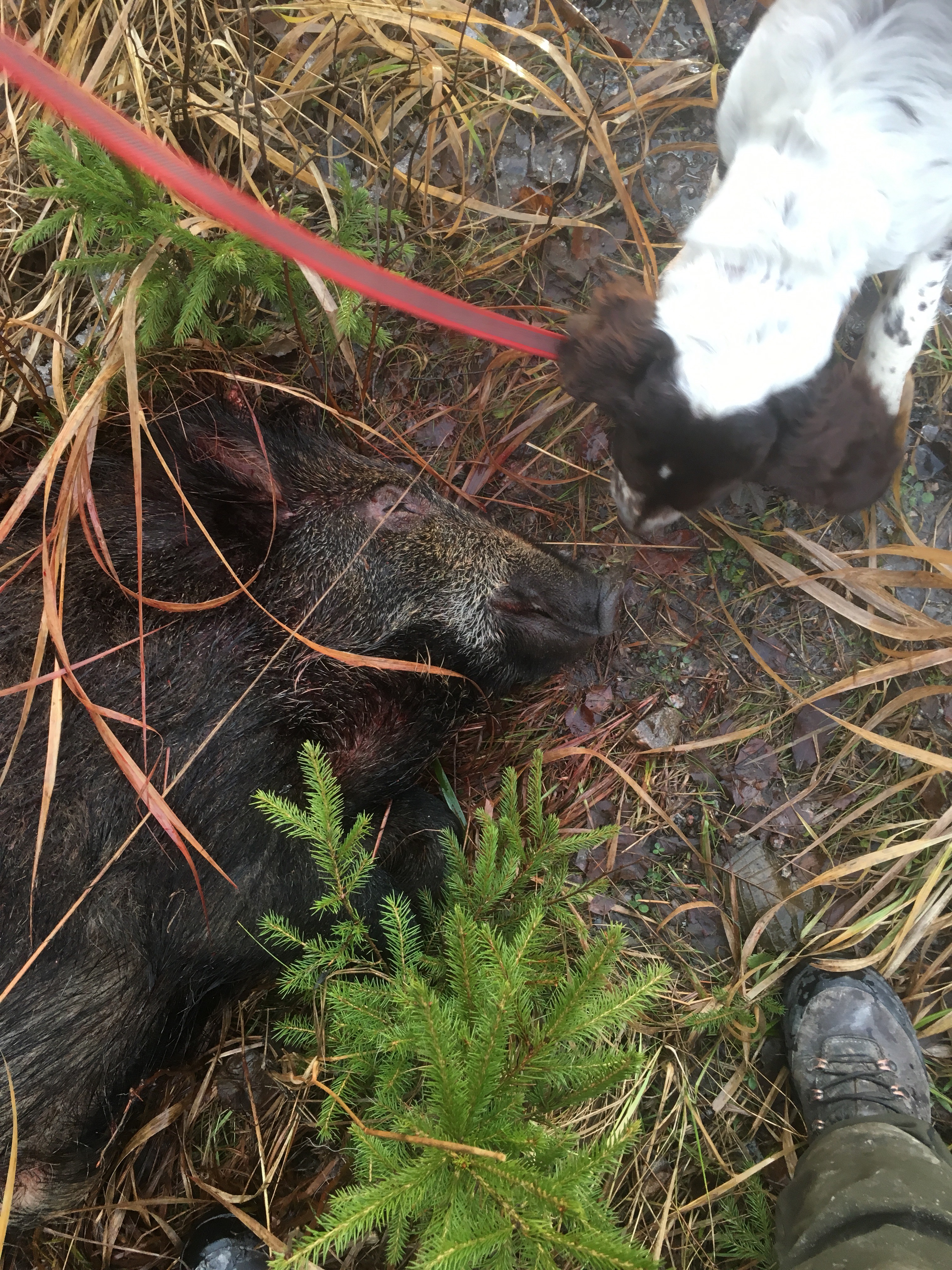 Så vi samlades där grisen sköts. För mig blev det ett perfekt tillfälle att låta Bella nosa på grisen. Superbra! Hon nosade och slickade på den men var inte helt galen i den. Ganska bra och sansat. Vildsvinen ska man ha respekt för annars kan det gå illa.