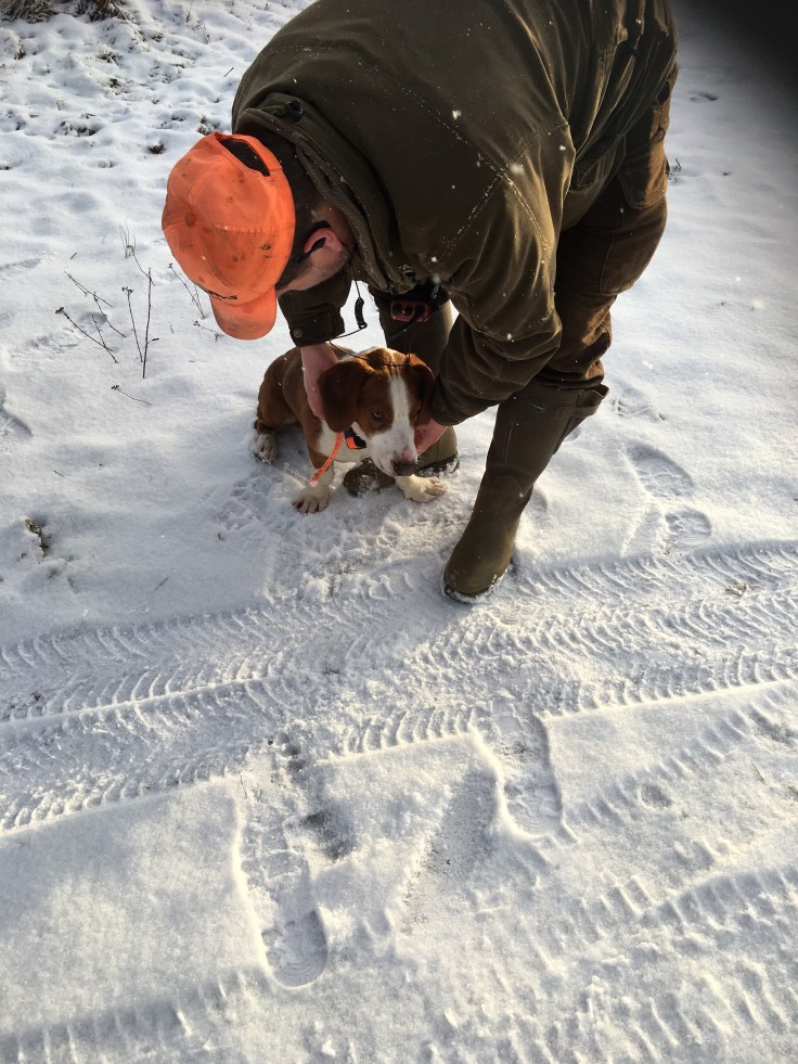 Get med kid gick sen över den lilla skogsväg som jag stod på. Tyvärr 100-150 meter från mig. Lite surt. De kom i lugnt och fint tempo. Drevern kom några minuter efter och fortsatte mot andra skyttar. Dessvärre kom ingen åt dem och när det hade gått ett timmar var tårna frusna och det var dags att bryta. Det var dessutom ganska hårt för tassarna och det blödde lite när han väl var tillbaka till sin husse.