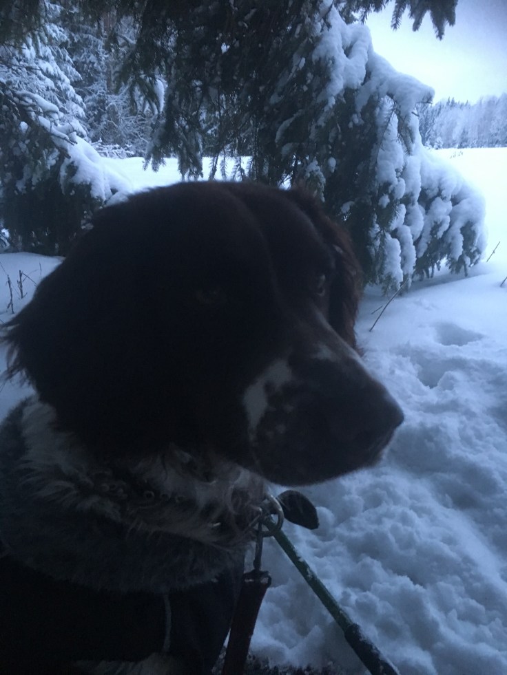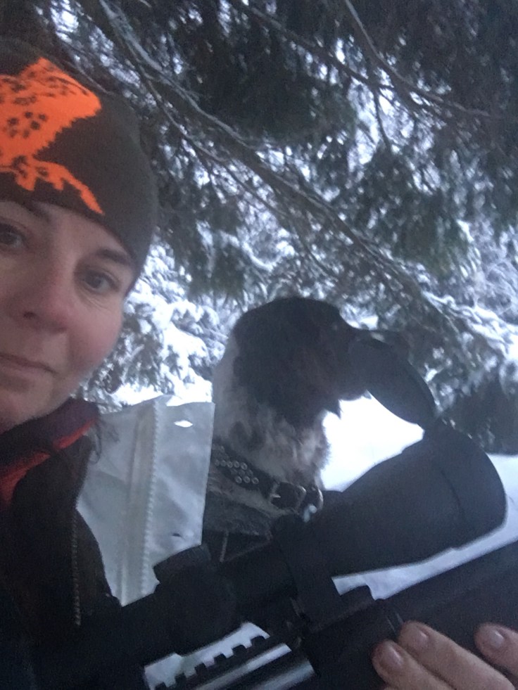 Vi satte oss under en gran och hade varsinn skjutriktning. När Emil började blåsa i pipan höll Bella på att få fnatt. Men hon är ju världens bästa hund så hon gillade läget och satt tyst och stilla. Men blicken sa vad hon tyckte.