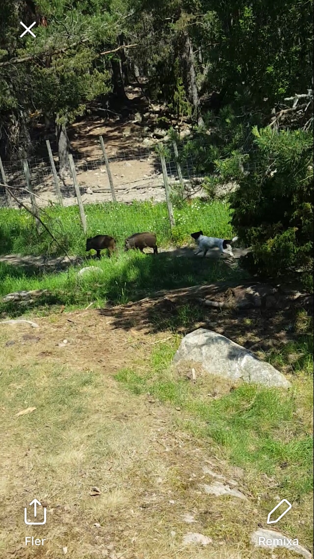 I jakthägnet sprang hon på två brungrisar och satte av efter dem. Hon tyckte det var skoj och svansen gick. Hon sprang efter dem men var samtidigt försiktig. Klokt! När en gris stannade av så tvärnitade hon och avvaktade. Hon drev och vi bestämde oss för att avsluta när det gick bra. Hon kom lydigt på inkallning säkert mest för att hon var trött då.