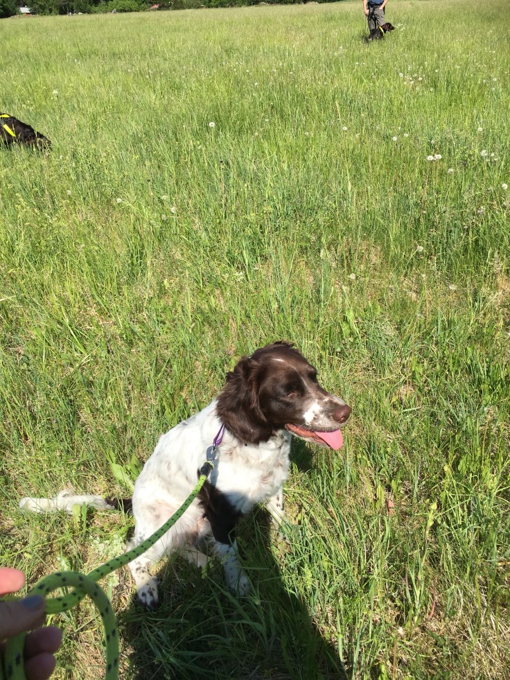 Där fick vi träna på släpspår av kanin i olika omgångar (för att motivera till drev på hare). Första gången gick lite skakigt för nästan alla, i alla fall för Bella. Unghundar är lite för ivriga. Bella sprang över kaninen ett par gånger men missade den. Efter något omtag hittade hon den och tryckte nosen i den men ville inte bära. Lite för snabbt tempo men stort intresse!
