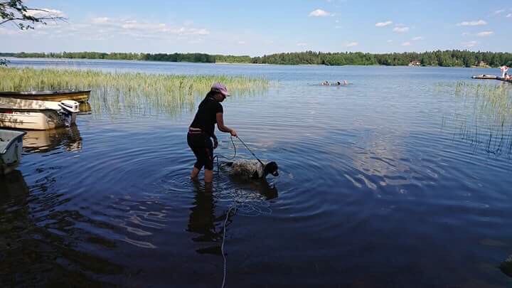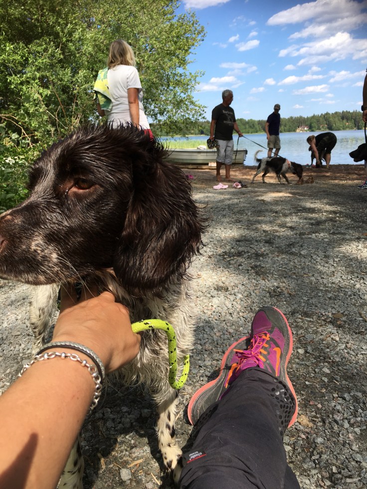 Sen for hela gänget till sjön för att träna på momentet simma. Vilken räddning i denna galna värme. Bella har ju simmat ett par gånger så jag var rätt säker på att hon skulle gå i. Det gjorde hon men det var så långgrunt så det tog en stund innan hon simmade.
