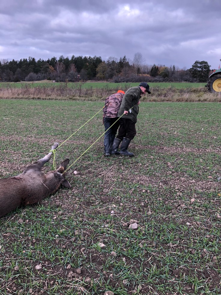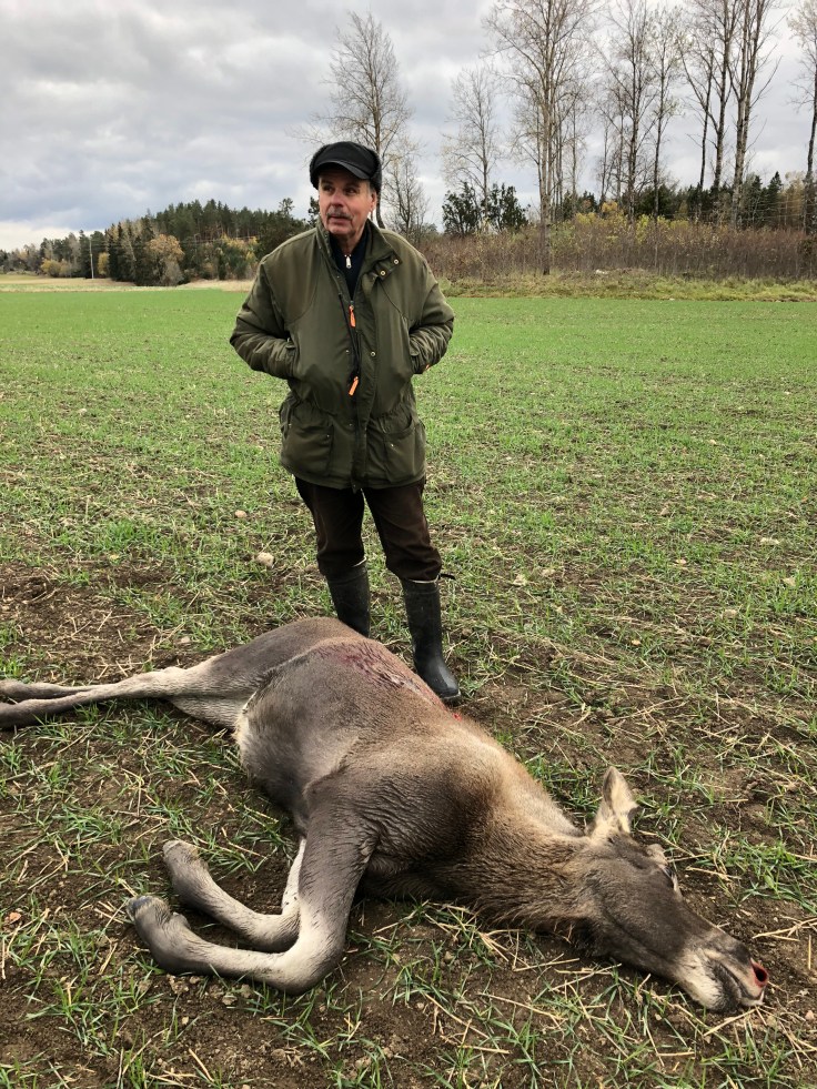 I andra såten gick en av killarna med sin stöthund. Ko och kalv syntes till och stöttes fram. Jag satt i samma torn där jag sköt tjuren. Plötsligt rusar ko med kalv rakt ut mot mitt torn. Kon i trav och kalven i galopp. Det gick för snabbt för mig och fick inget bra skottläge på kalven som doldes av kon. De sprang vidare mot nästa passkytt och jag ser hur de stannar till. Då kommer smällen och kalven skjuts. Trots en bra lungträff går kalven ca 200 meter innan den lägger sig. Så idag fick vi gratulera Göran