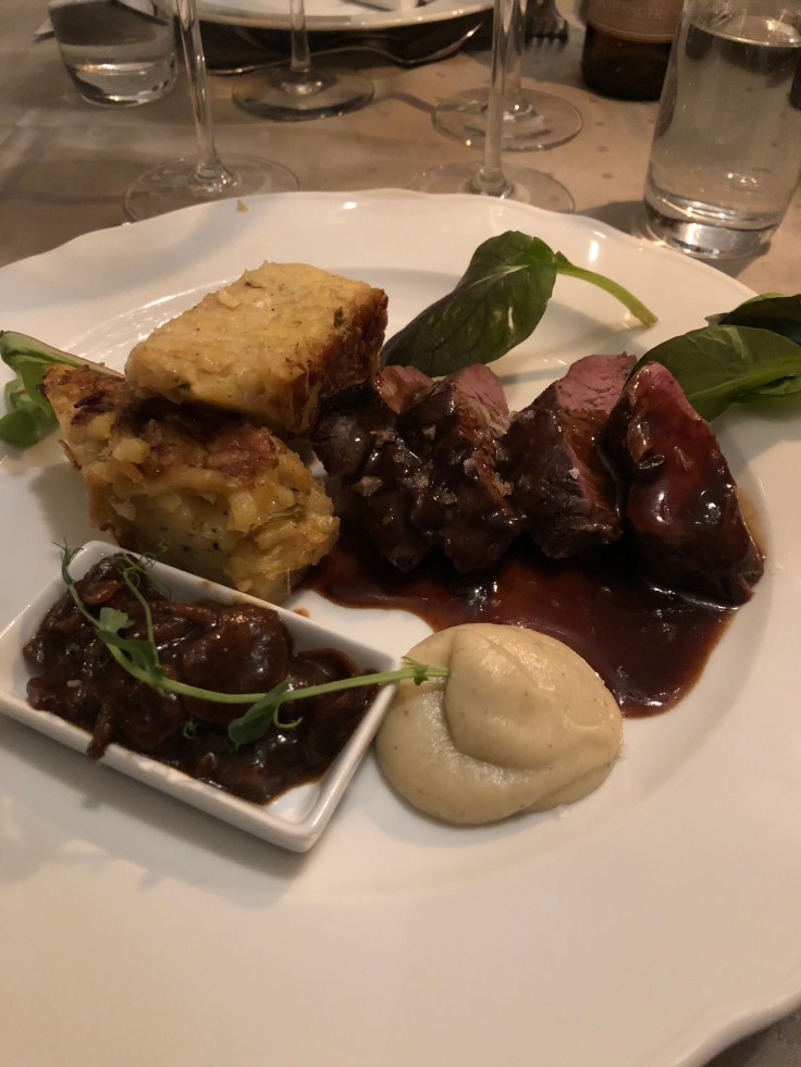 Middag på slottet på kvällen. Rökt dovhjort till förrätt och file av kronhjort till huvudrätt. Galet gott!