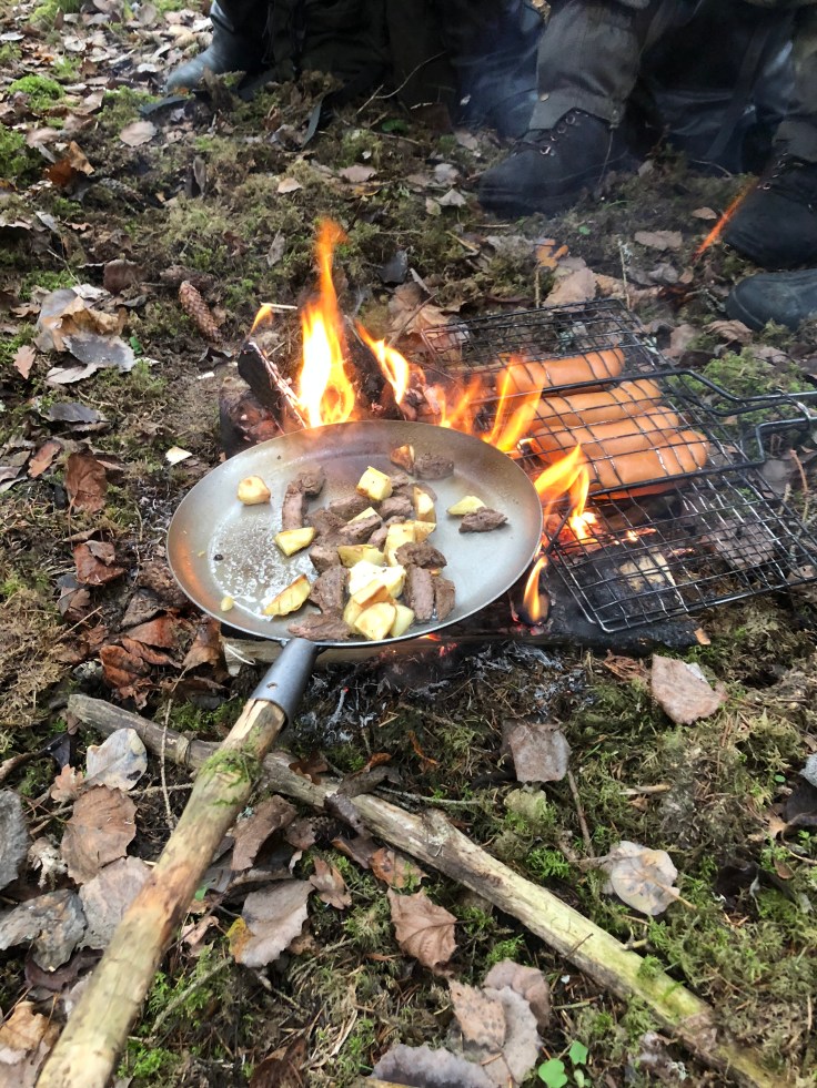 Sen lunch och det smakar lika bra som en middag på slottet med grillad mat i skogen.