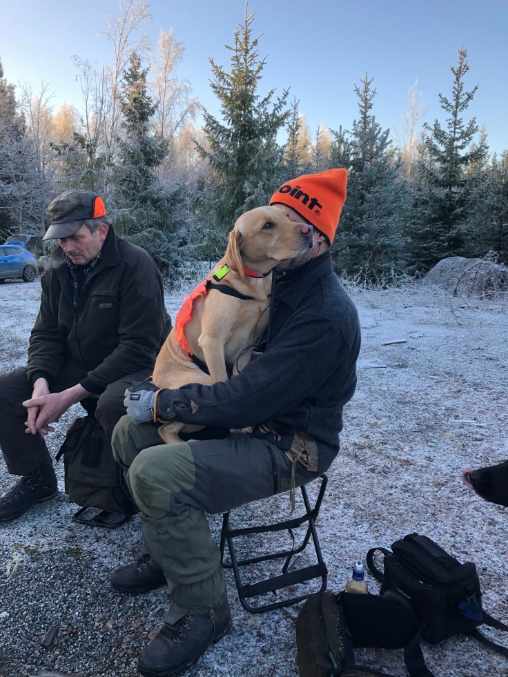 Hon får iväg och det syntes på henne att hon hade spår i näsan. Sökte ut bra och for sen iväg på drev. Det är underbart att höra henne driva. Jag stod still när hon drev och hoppades att det skulle gå på mig men det gjorde det inte. Ett drev gick iväg väldigt långt och bort från drevkedjan. Kul att hon är taggad. Denna såt blev rätt stor och tog tid eftersom jag väntar in henne och låter henne söka och driva i lugn och ro. Nu börjar jag kunna läsa henne och hon är lätt att tyda. Krille ropar på radion att han har skjutit gris. Vi får sen bekräftat att den ligger! Så kul! De stöttes av Matte och labbarna som gick in från ett annat håll.