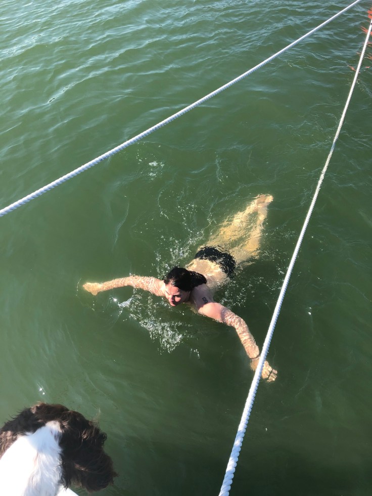 Har bestämt mig för att inte vara badkruka längre, så det blev ett dopp från båten. Bella hade redan simmat men blev klart störd över att jag badade utan henne.