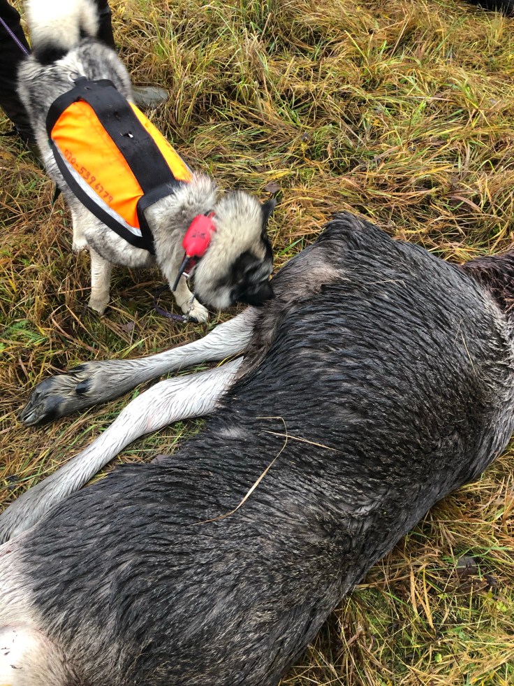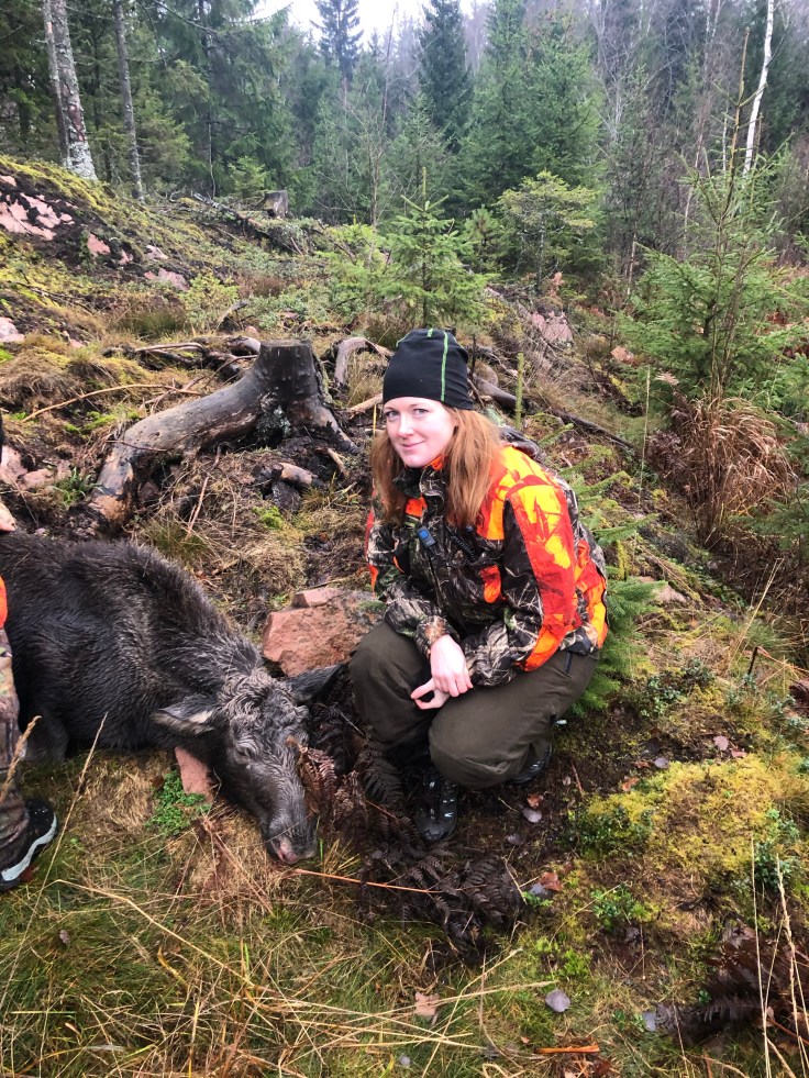 Plötsligt hörs ett skott avlossas och spänningen är olidlig. Sen säger Malin på radion att hon har skjutit en älgkalv och att den ligger. Så galet skoj! Malin har inte jagat så mycket och detta var hennes första vilt. Då är det extra roligt. Ett perfekt lungskott avlossade hon och det var kul att sen få gå fram och gratulera. Hon var väldans glad och väldans skakig, precis som alla är när man nyss har skjutit ett djur. Stort grattis Malin!