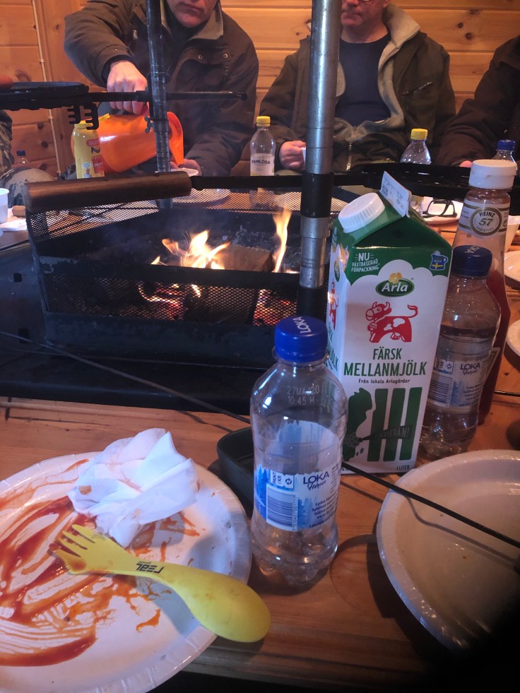 Ganska snart studsar rådjur ut på en skytt som dock inte hinner med att skjuta. Sen blir det korvgrillning i kåtan. Mys!