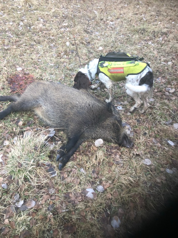 Första såten inleddes med ett par rådjursdrev. Sen var det lugnt och inga grisar låg på det vanliga stället. Börjar misströsta lite! När det är ca 100 meter kvar till passlinjen bryter allt plötsligt loss och det blir galen action i skogen. Bella tar upp vildsvin som ligger och trycker 50-60 meter framför mig. Hon skäller några gånger med sitt extremt mörka och dova skall som gör att jag numer med säkerhet vet att det är vildsvin. Sen går vildsvinen loss och går ut till höger om mig mot håller där Bea och Lansa är. Varnar på radion. Bella driver sen flocken ner bakom mig, jag har dem på bra skotthåll och skymtar några svarta öron men ser inte mer än så. Bella ligger i och håller i länge. Så roligt! Duktig vovve!