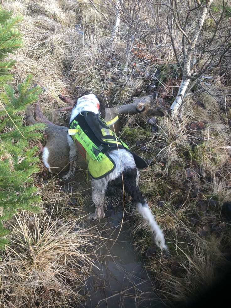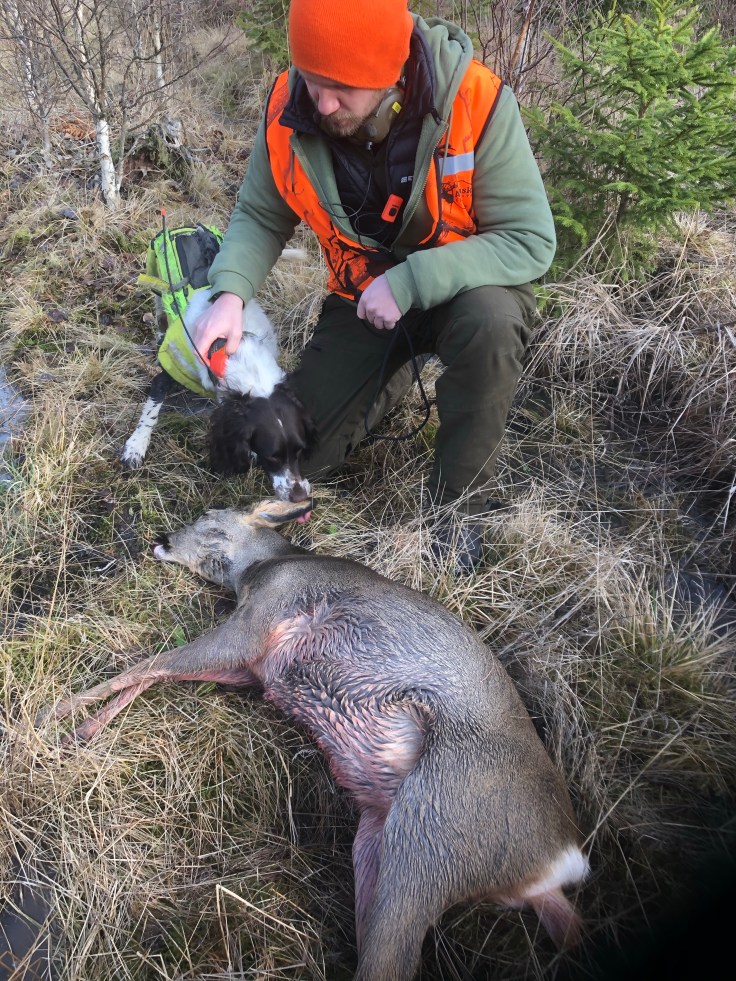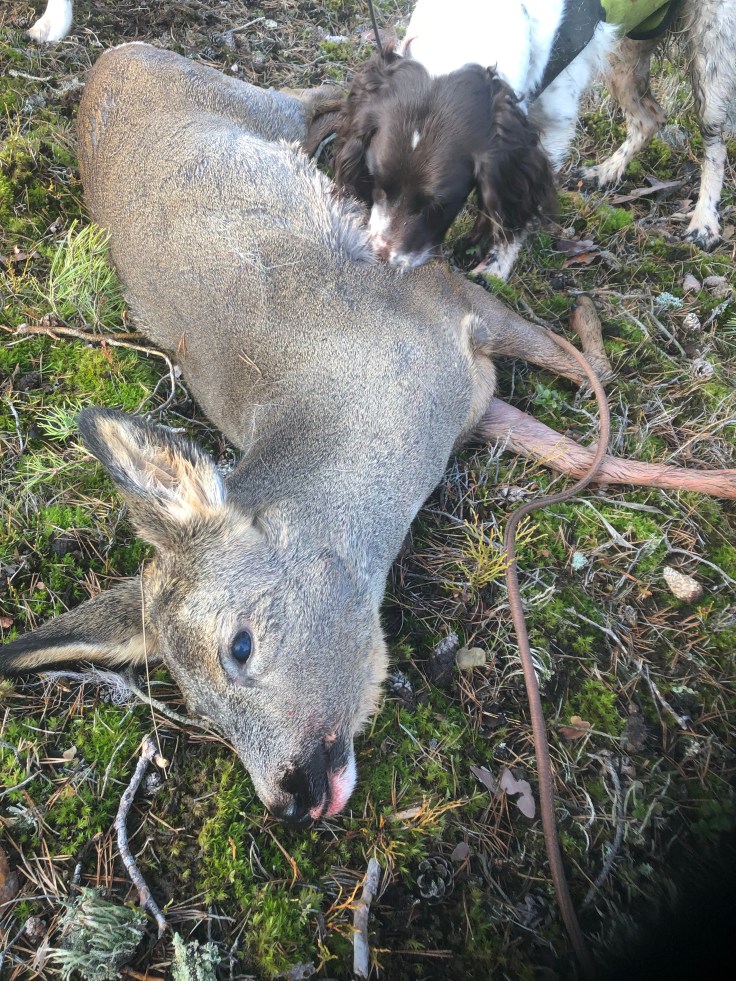 Knatade vidare och det blev ett par till kortare drev. I slutet av såten släppte jag in Bella i en granplantering och där tar hon upp och driver. Jag står still och njuter av hennes drev och blir så glad när jag sen hör ett skott. Morgan rapporterar att han har skjutit rådjur och fick sen Se Bella komma i det spåret. Hon skäller lite på det men börjar sen väcka igen och jag tänker att rådjuret rest sig. Precis då dyker ett rådjur upp bakom en gran på fem meter. Jag står med lyft bössa och väntar att den ska lämna granen. Mycket märklig känsla att stå och glo på ett rådjur så nära genom en gran. Ser att det lyssnar efter. När jag skruvar ner förstoringen på siktet tar jag ett litet snedsteg och kliver ner i en frusen vattenhåla så det låter lite. Rådjuret flyttar på sig och jag har ett kanonläge. Men jag vet att det står en passkytt ca 300 meter bort och utan kulfång får jag hålla inne på skottet. Men Bella kommer i spåret och driver det vidare men ute på åkern springer den fort så passkytten där får inget bra läge. Jag går fram till Morgan som sköt och vi hittar rådjuret. Bella bryter och kommer fram sen igen. Stolt och slickar i sig blod från skotthålet. Första rådjuret för Bella men även för Morgan. Extra skoj!