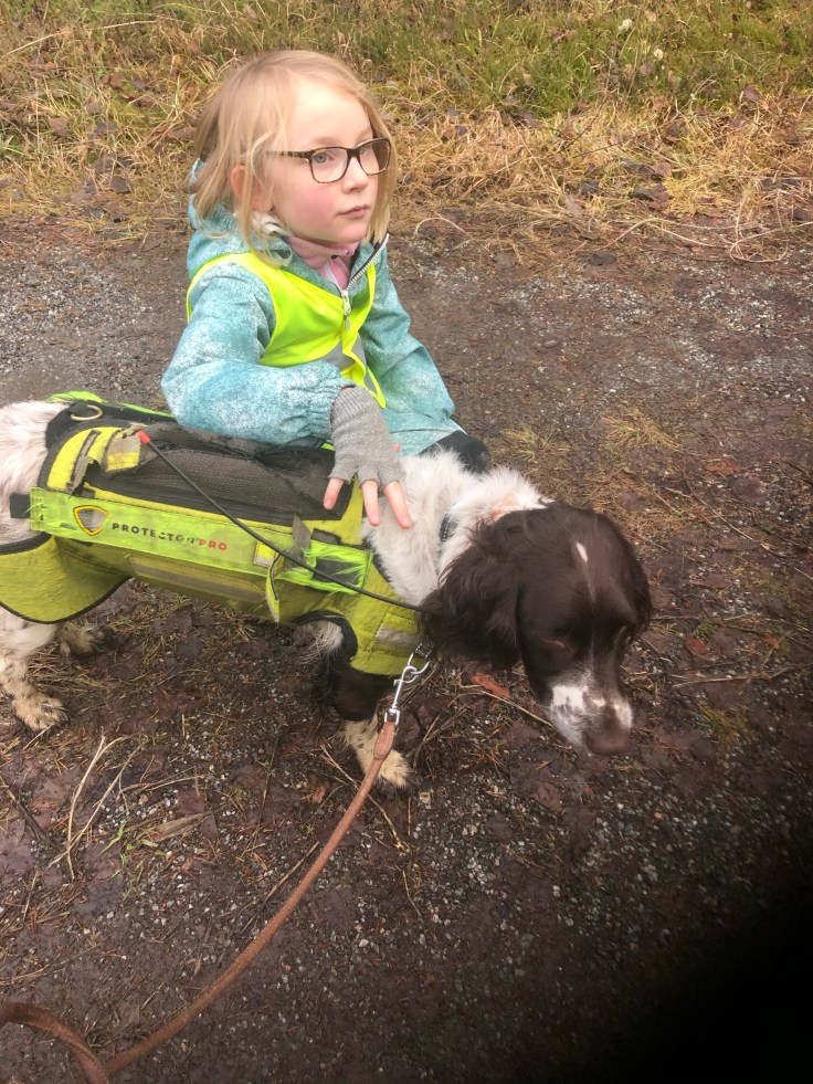 Sen såt två! Drev av Bella igen och tyckte att skallet lät konstigt. Fick sen höra att det var räv hon drivit. Kul! Älg och rådjur i såten. Sanna fick ett rådjur i full kareta på sig. Inte bra skottläge då. När vi brutit samlades vi. Lilla Smilla hade gått en lång runda med sin pappa och deras hundar. Bella blev glad över att få gosa med en liten tjej.