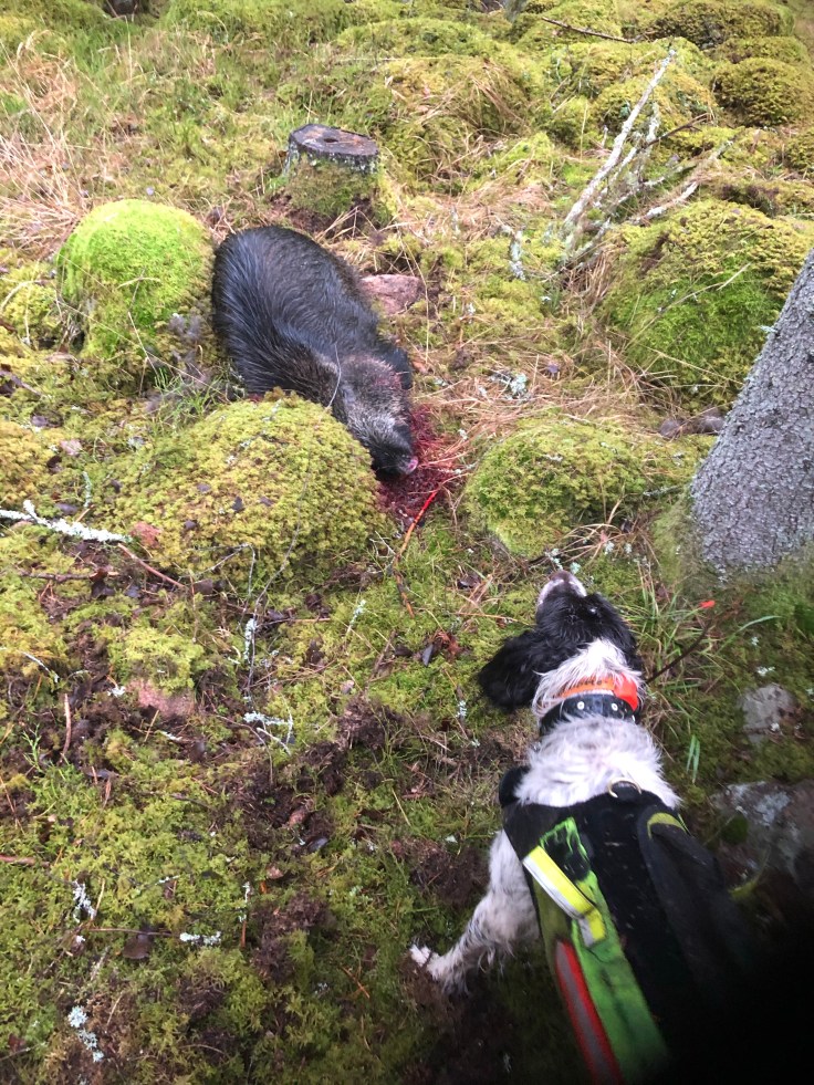 Bella var inte med på det drevet men innan hade hon troligen satt fart på gris. Skällde väldigt mörkt i ca 200 meter och släppte sen. Vet inte var det tog vägen. Strax efter stötte jag upp ett rådjur som stod och tryckte vid ett fällt träd i en dalgång. Bella tog upp och drev det 400-500 meter. Bra återgång och strax efter det tar hon upp rådjur som hon direkt springer på. Hon blir så arg eller uppspelt att drevskallet inleds med skrik. Kul att höra och ännu roligare att sen höra ett skott. Två rådjur skjutna i samma pass och jag ser på GPS:en att hon stannar där en stund. Sen kommer hon tillbaka. Där är det dags att bryta och avsluta jakten. Känner mig nöjd över en väldigt trevlig och bra jaktdag.