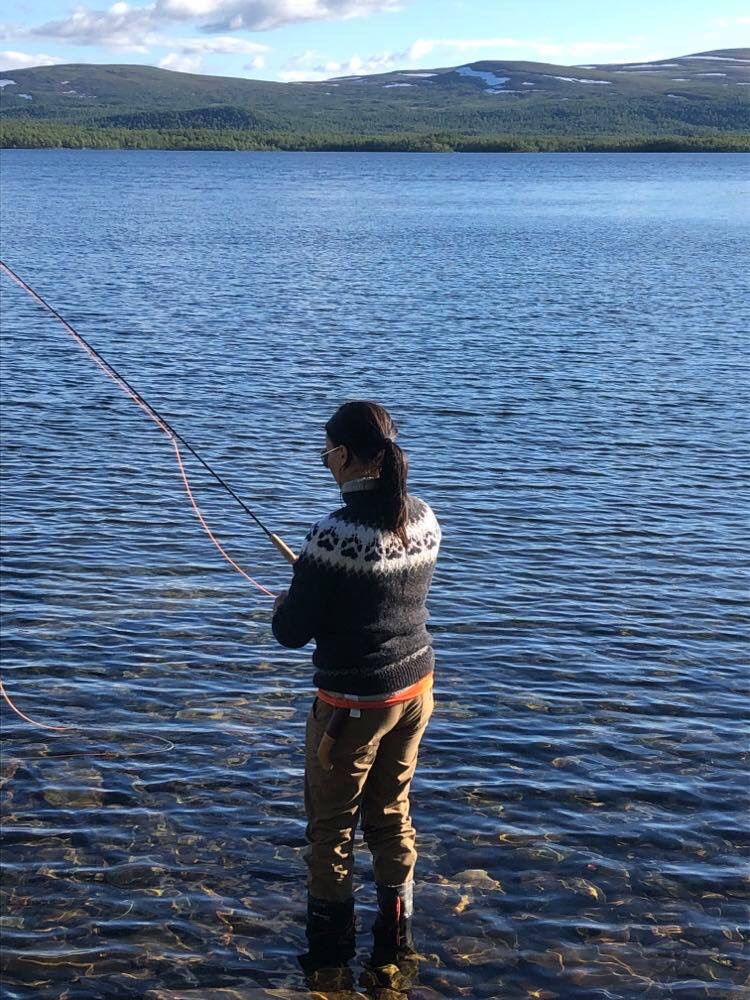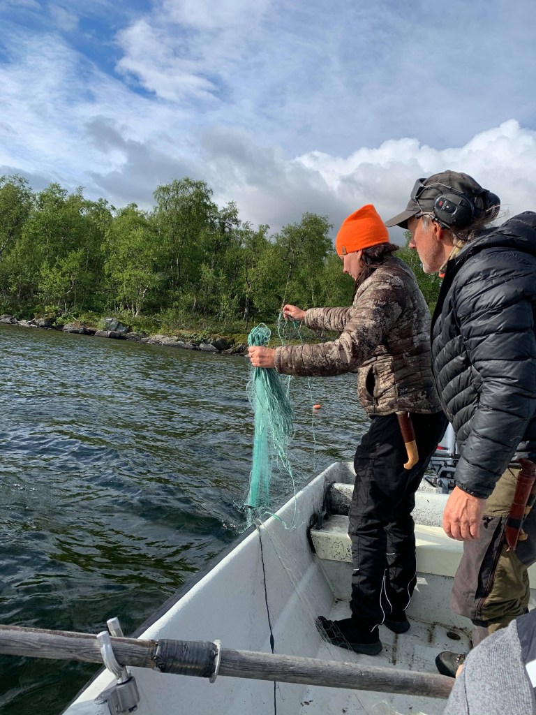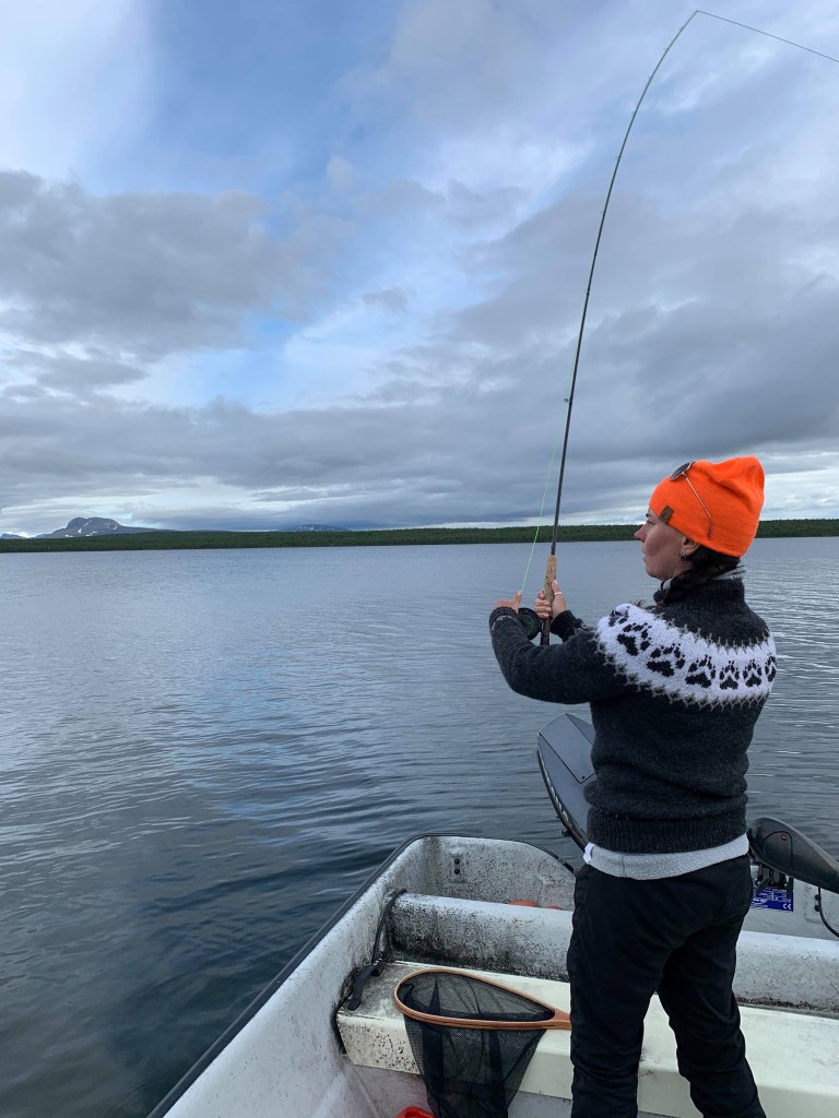 Det blev också en del fiske men det nappade dåligt. Jag fick äntligen testa att fiska med fluga både på sjön och i ån. Men det var för kallt och ingen kläckning av flygfän så det gick inte så bra. Men det var grymt roligt att testa. Vi kastade även lite och Nenne var en hejare på haspel!Däremot fick vi några fina öringar och rödingar när vi la nät med Birger.