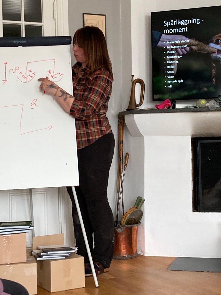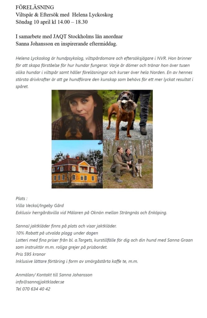I söndags var vi på ett fantastiskt event arrangerat av Sanna J jaktkläder . Det bjöds på smörgåstårta och rabbat på mängder av kläder. Så klart gick det inte att motstå. Huvudnumret var en föreläsning om viltspår och eftersök med Helena Lyckoskog. Jösses vad bra hon är! Hon var en fängslande föreläsare där hon delade med sig av sin enorma kompetens i ämnet. Vi deltagare fick så många bra tips i hur vi ska utvecklas i träningen och fick en riktig kick för att komma igång igen. Stort tack! Fick också med mig hennes nya bok och den rekomenderar jag verkligen. Köp den här.