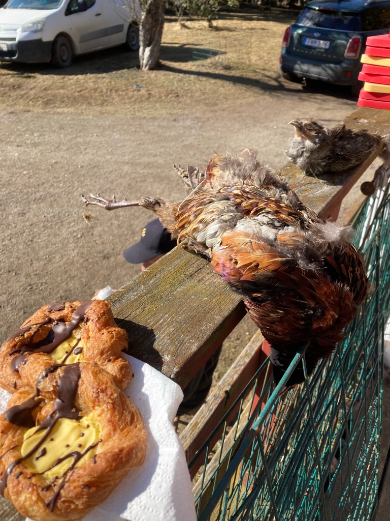 Men när den spatserar i inhägnaden och kacklar på morgonen och får igång Bella som skäller och kastar sig mot fönstren och stressar upp Milton samt får upp alla i familjen som studsar upp och är på uruselt humör, så känns det som att den kan flytta härifrån. Man förstår att den väcker känslor när maken frågar när det är jakttid på fasan. Samma fenomen inträffar när de små ekorrungarna ligger under trappen och retar Bella. Hon blir helt galen och fixerad. Trots en nära döden upplevelse hoppar den fortfarande runt här hemma! Jösses!
