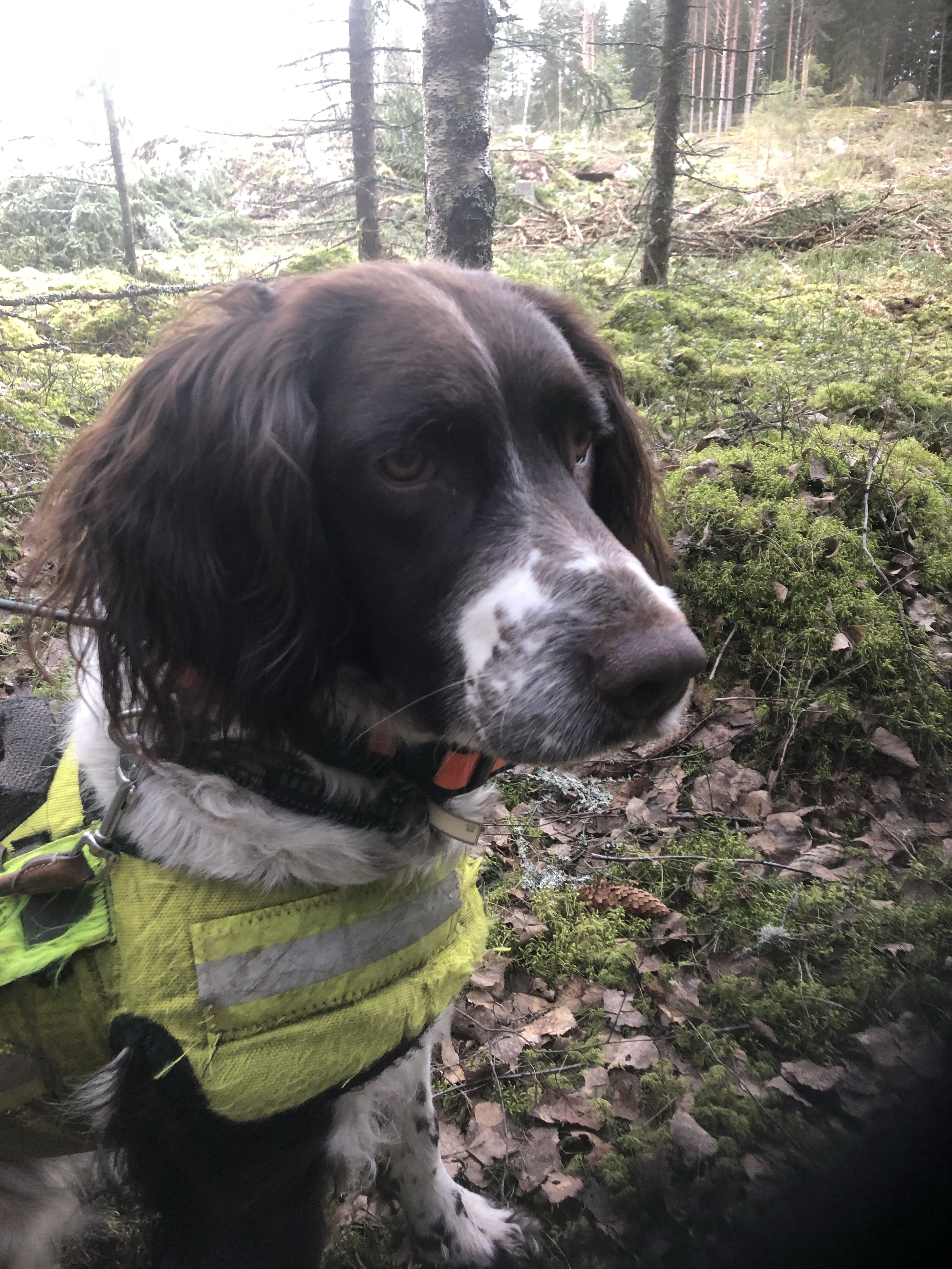 Vi knatar ut till viltåkern där två skyttar sitter. Rapporter om älgar rasar in och plötsligt har jag en älg bredvid mig. Bella tar upp den och driver i en halvcirkel runt mig. Jag står bara och njuter av hennes drevskall som sen övergår i ståndskall när älgen ställer sig inne i en grantätning. Lansa tar upp samma spår och kommer sen in på ståndet. Bella har skällt rätt länge då och bryter. Lansa är lite mer ihärdig men verkar bryta när älgen sätter fart igen. My god, vilket tempo! Så galet roligt! Ingen älg fick skjutas men både hundförare och tre passkyttar hade bra läge på en eller fler älgar.