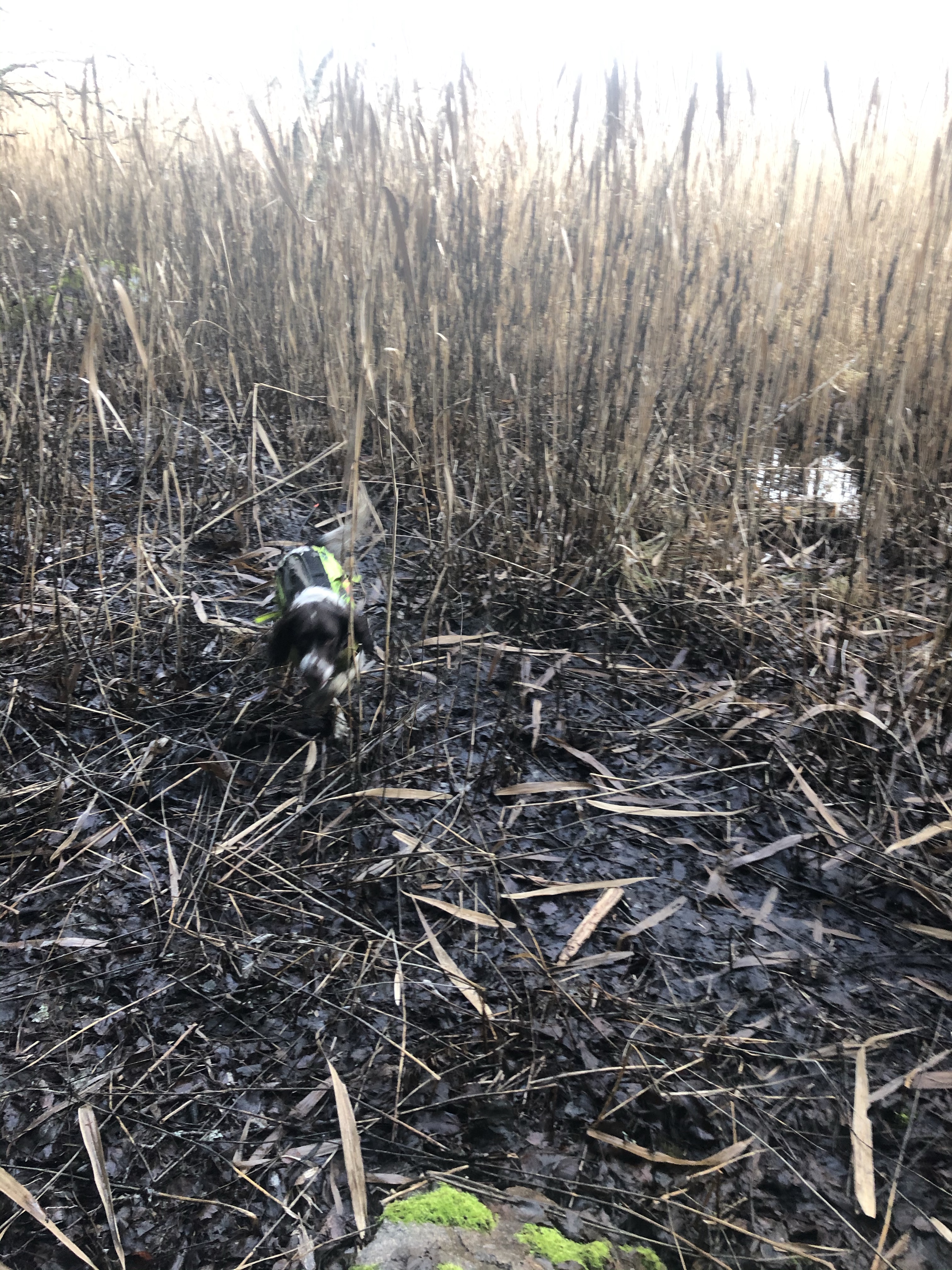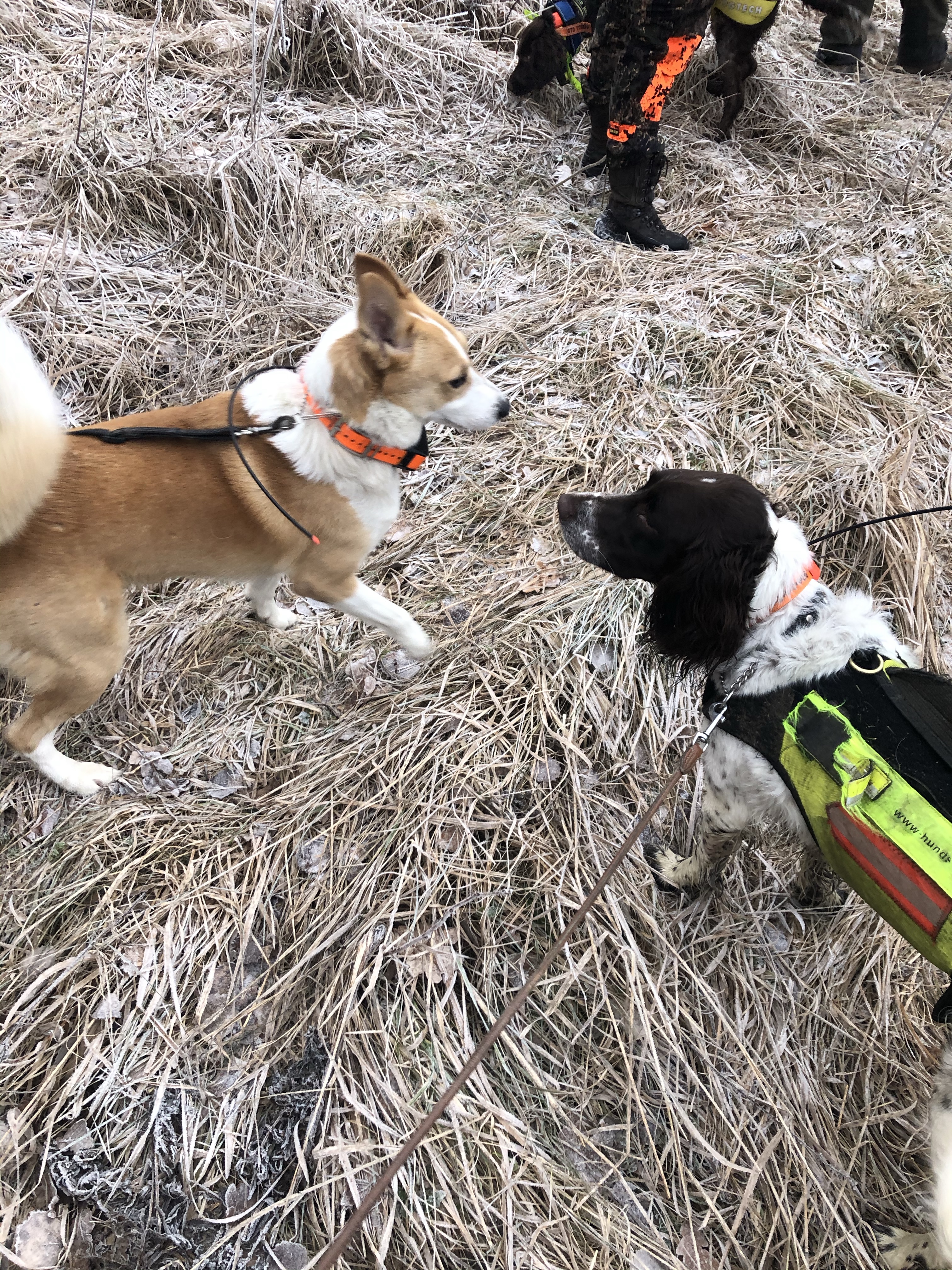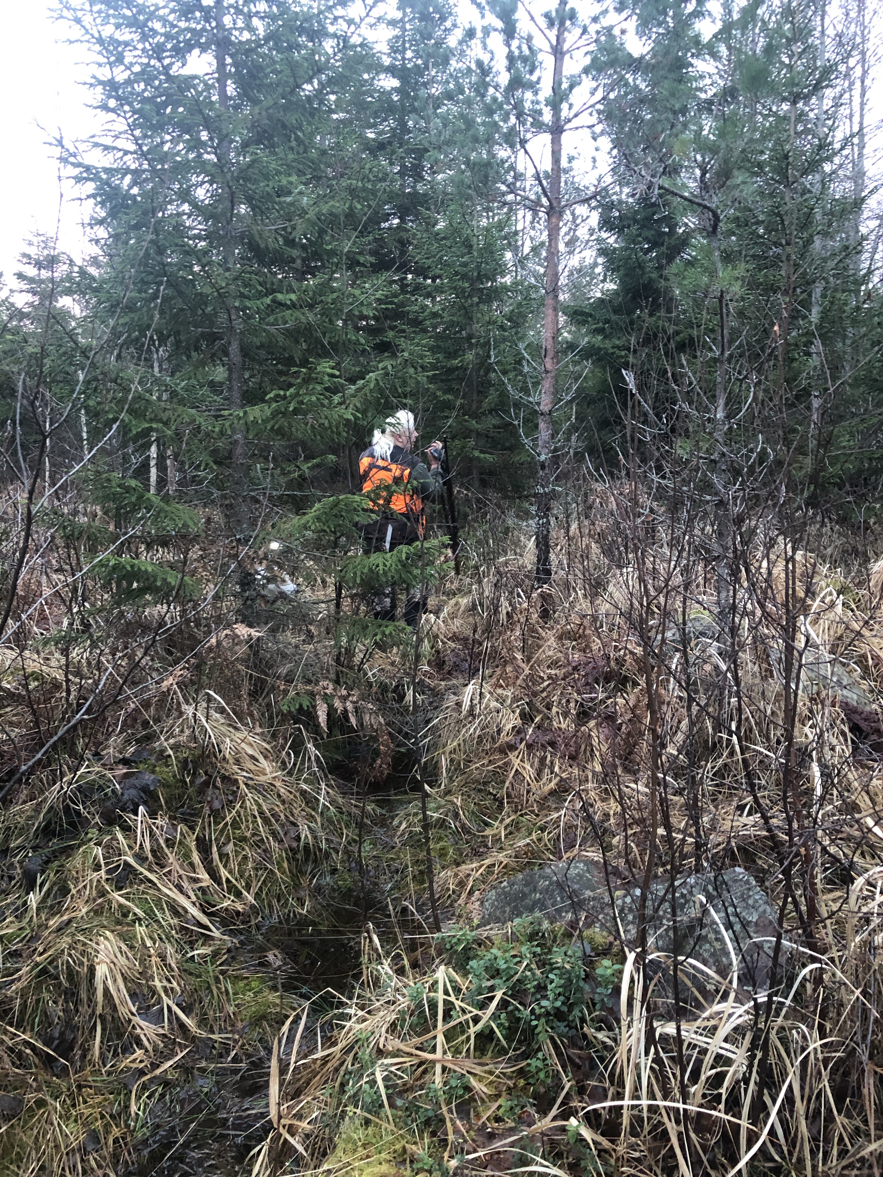 Vi knatar ut till viltåkern där två skyttar sitter. Rapporter om älgar rasar in och plötsligt har jag en älg bredvid mig. Bella tar upp den och driver i en halvcirkel runt mig. Jag står bara och njuter av hennes drevskall som sen övergår i ståndskall när älgen ställer sig inne i en grantätning. Lansa tar upp samma spår och kommer sen in på ståndet. Bella har skällt rätt länge då och bryter. Lansa är lite mer ihärdig men verkar bryta när älgen sätter fart igen. My god, vilket tempo! Så galet roligt! Ingen älg fick skjutas men både hundförare och tre passkyttar hade bra läge på en eller fler älgar.